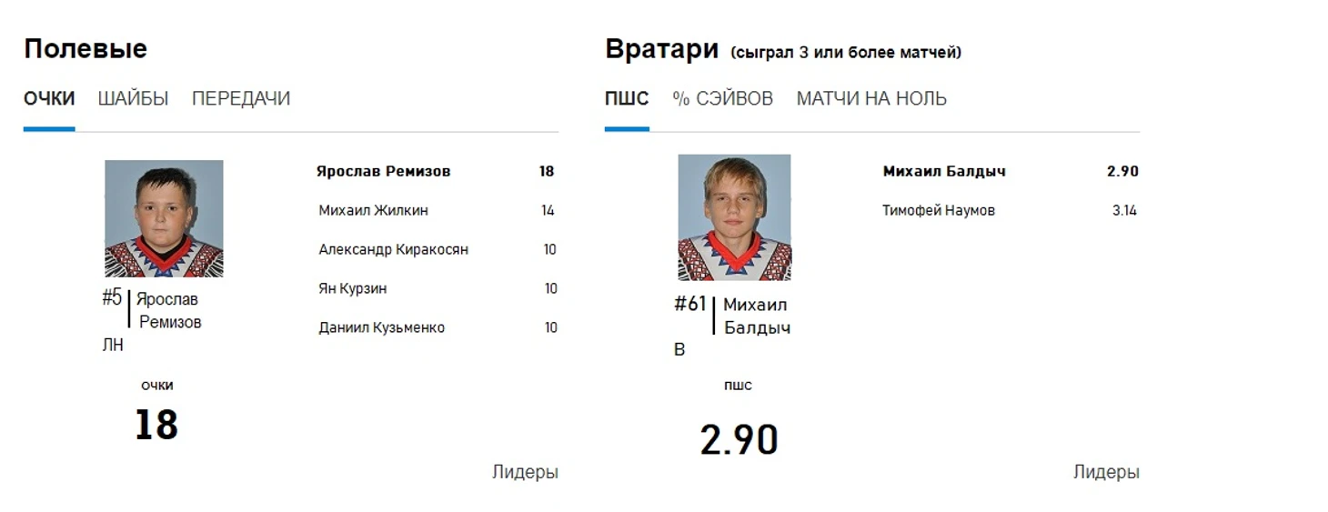 Начинаем с классики. Очки, голы, передачи у полевых, сейвы, сухари и коэффициент надёжности у вратарей.