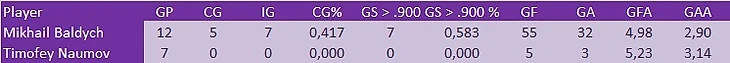 Таблица 2: Игрок, Игр сыграно, Сухих матчей, Бросков в равных составах, Отражённых бросков в равных составах, Пропущено голов в равных составах, %отражённых бросков в равных составах, Бросков в большинстве, Отражённых бросков в большинстве, Пропущено голов в большинстве, %отражённых бросков в большинстве, Бросков в меньшинстве, Отражённых бросков в меньшинстве, Пропущено голов в меньшинстве, %отражённых бросков в меньшинстве