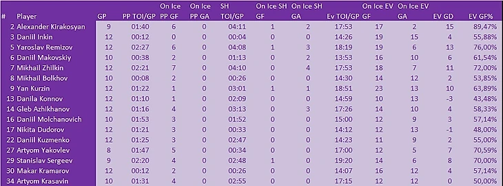 А вот это уже интереснее. Посмотрим, кто и сколько очков набрал в ситуациях равенства, большинства и меньшинства. И увидим, за счёт чего Ремизов оторвался от Жилкина - абсолютное равенство при игре 5 на 5, но в большинстве у Ярослава 1+4, в то время, как у Миши - 1+0. Забавно, что при численном перевесе нет очков у Молчановича. 5 из 11 голов в большинстве - у защитников, а у Киракосяна вообще набор очков в равенстве идентичен большинству. Лидерство же по победным шайбам на данный момент делят Болхов и Коннов. Сокращения по столбцам: Номер, Игрок, Игр Сыграно, Голы в Равных Составах, Очки в Равных Составах, Голы в Большистве, Очки в Большинстве, Голы в Меньшинстве, Очки в Меньшинстве, Голы в Овертайме, Победные Голы.
