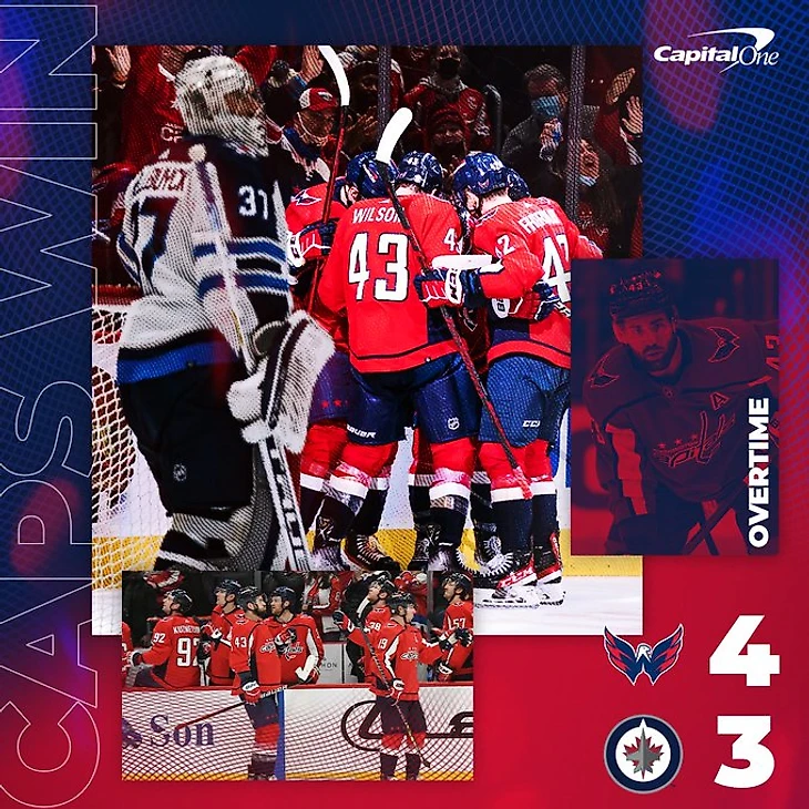 "Вашингтон Кэпиталз"-"Виннипег Джетс" 4:3 (ОТ).Томас Уилсон в овертайме принёс победу хозяевам.Томас Уилсон и Дмитрий Орлов набрали по 2 очка (1+1),Александр Овечкин забросил одну шайбу,Евгений Кузнецов отдал результативную передачу,Витек Ванечек отразил 30 бросков.