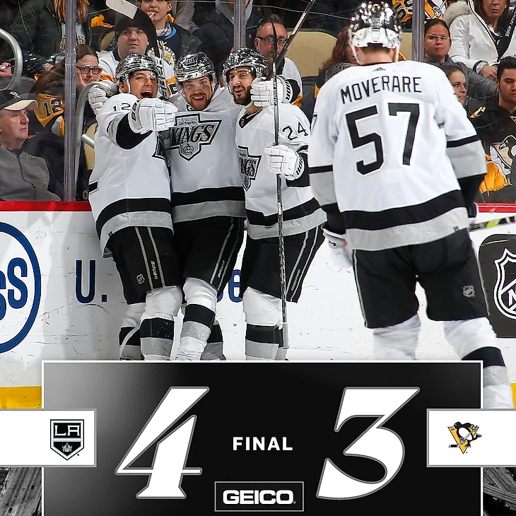 "Питтсбург Пингвинз"-"Лос-Анджелес Кингз" 3:4.В середине третьего периода Тревор Мур забросил победную шайбу.Тревор Мур забросил 2 шайбы,Анже Копитар отдал 2 результативные передачи,Кэлвин Петерсен отразил 23 броска.У хозяев Брайан Раст забросил 2 шайбы,Сидни Кросби набрал 2 очка (1+1),Крис Летанг отдал 2 результативные передачи,Евгений Малкин отдал результативную передачу.