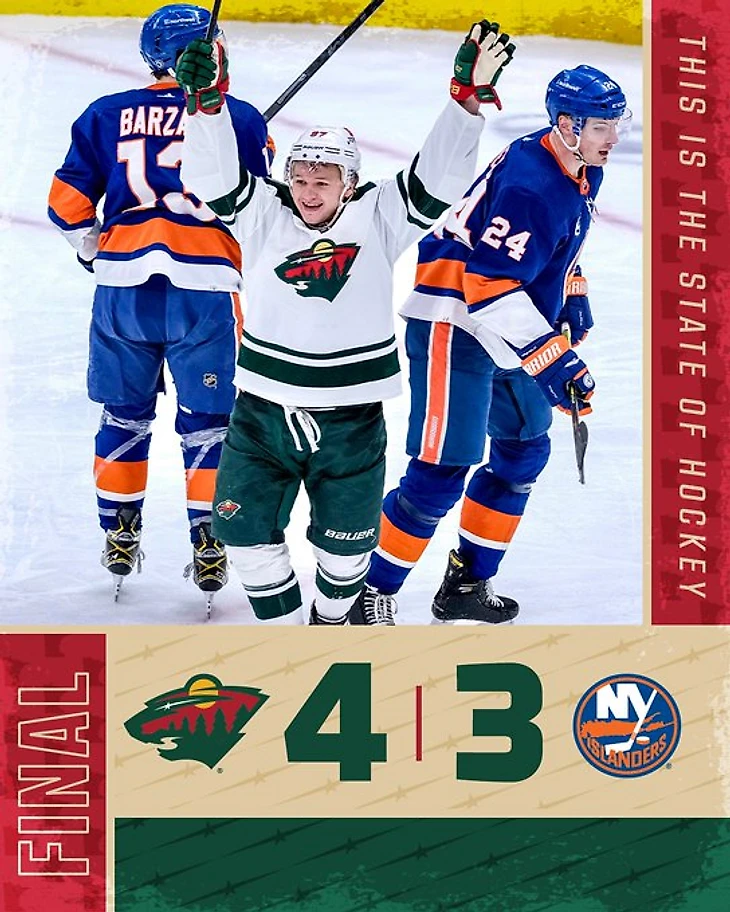 "Нью-Йорк Айлендерс"-"Миннесота Уайлд" 3:4.Мэтт Болди с Йонасом Эрикссоном и Кириллом Капризовым набрали по 2 очка (1+1),Мэттью Дамба отдал 2 результативные передачи,Каапо Кахконен отразил 40 бросков.