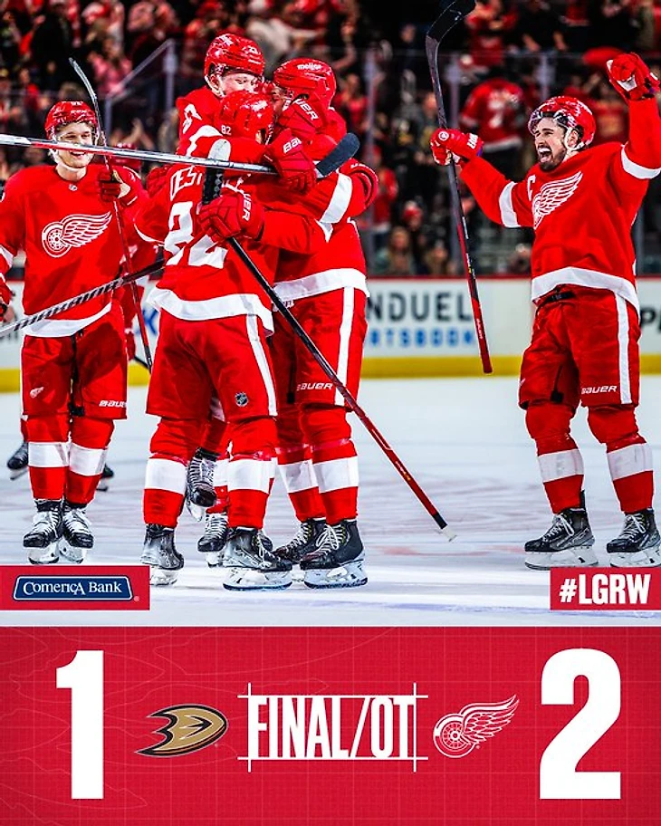 "Детройт Ред Уингз"-"Анахайм Дакс" 2:1 (ОТ).Джордан Остерле в овертайме принёс победу хозяевам.Дилан Ларкин набрал 2 очка (1+1),Алекс Неделькович отразил 14 бросков.