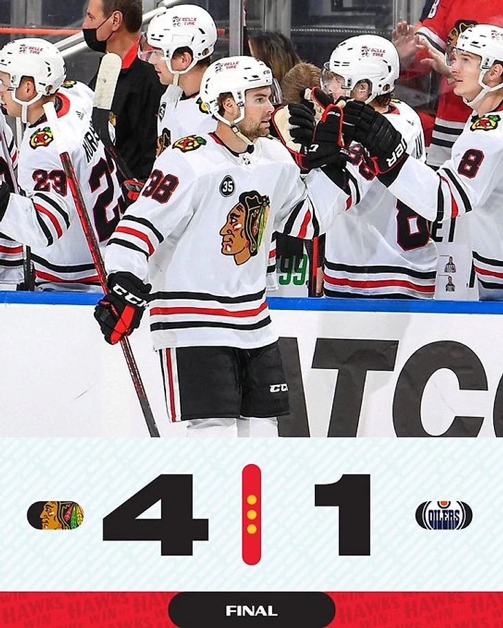 "Эдмонтон Ойлерс"-"Чикаго Блэк Хоукс" 1:4.Алекс ДеБринкат набрал 3 очка (1+2),Дилан Стром с Брендоном Хагелем и Кирби Дачем набрали по 2 очка (1+1),Марк-Андре Флери отразил 40 бросков."Чёрные ястребы" прервали серию из 3 поражений подряд.