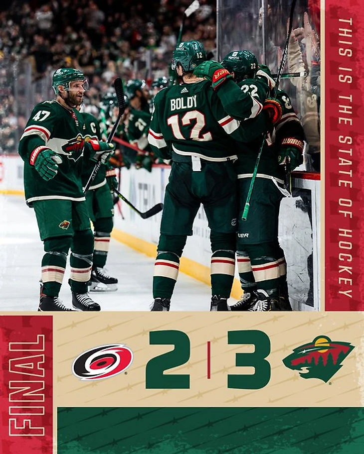 "Миннесота Уайлд"-"Каролина Харрикейнз" 3:2.Кевин Фиала и Фредерик Годро набрали по 2 очка (1+1),Кирилл Капризов забросил одну шайбу,Кэм Тальбо отразил 37 бросков.У гостей Андрей Свечников забросил 2 шайбы,Энтони ДиАнджело отдал 2 результативные передачи.