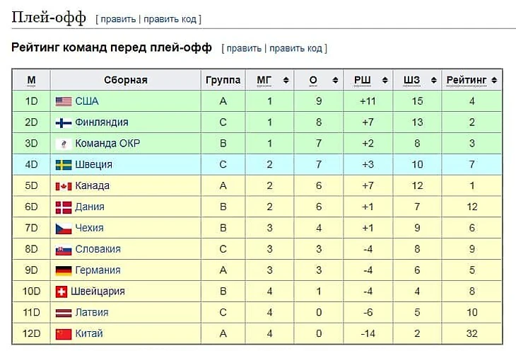 Получается, если четыре лучших команды группового этапа пройдут дальше, то полуфинальные пары будут выглядеть так: США (1 место в общей таблице) – Швеция (4-е), Финляндия (2-е) – Россия (3-е).