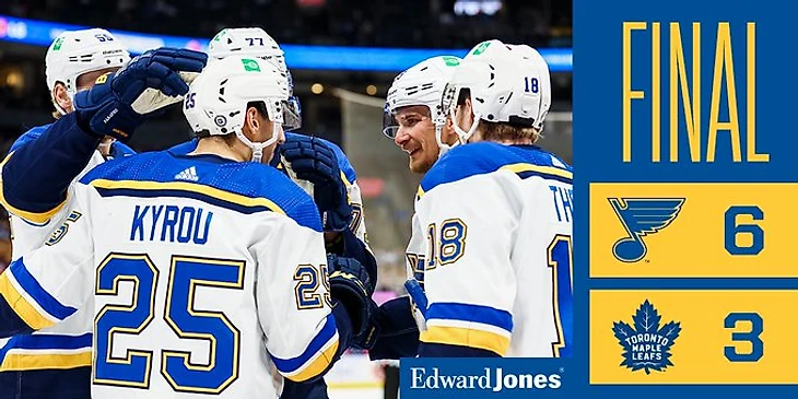 "Торонто Мэйпл Лифс"-"Сент-Луис Блюз" 3:6.Гости в третьем периоде забросили 3 шайбы.Павел Бучневич забросил 2 шайбы,Роберт Томас и Давид Перрон отдали по 2 результативные передачи,Клим Костин забросил одну шайбу,Вилле Хуссо отразил 34 бросков.У хозяев Вильям Нюландер забросил 2 шайбы,Александр Керфут отдал 2 результативные передачи.