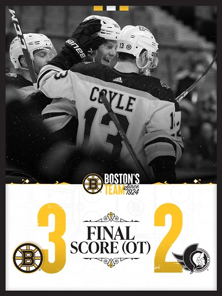 "Оттава Сенаторз"-"Бостон Брюинз" 2:3 (ОТ).Давид Пастрнак в овертайме принёс победу гостям.Майк Райлли отдал 2 результативные передачи,Джереми Суэймэн отразил 29 бросков.У хозяев Артём Зуб отдал результативную передачу.
