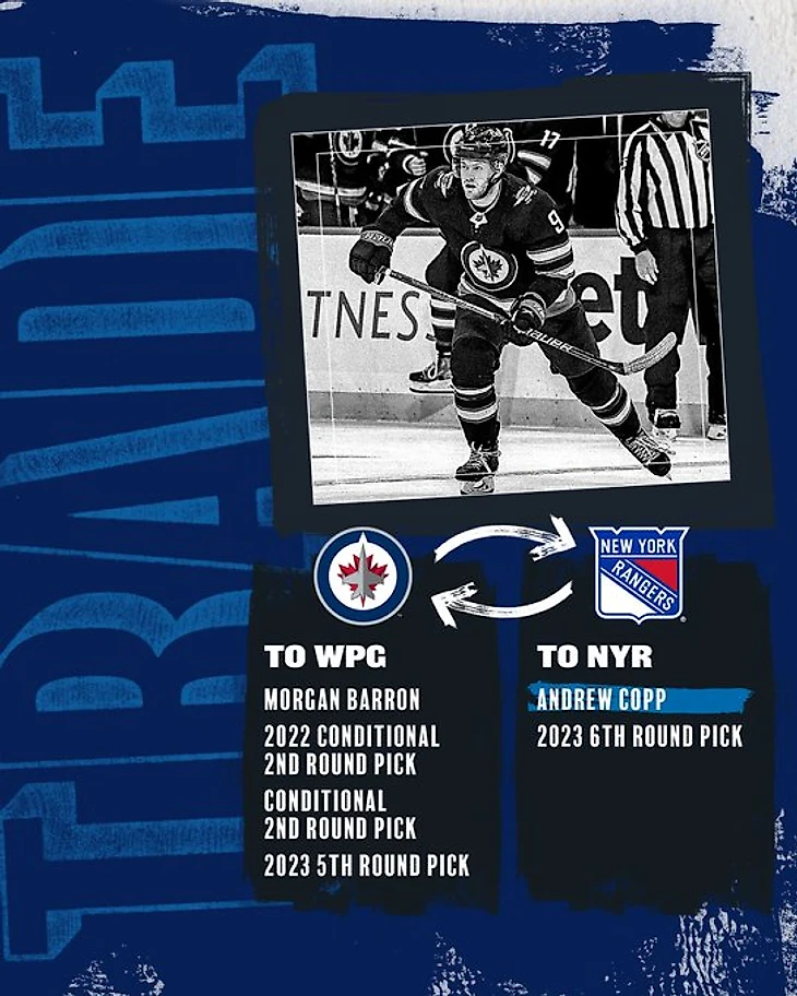 "Виннипегу" достается выбор во втором раунде драфта-2022 (он превратится в выбор в первом раунде, если "Рейнджерс" выйдут в финал Востока при заигранности Коппа минимум в половине матчей), выбор во втором раунде драфта-2022 или драфта-2023, выбор в пятом раунде драфта-2023, а так же нападающий Морган Баррон (0+1 в 13 играх).