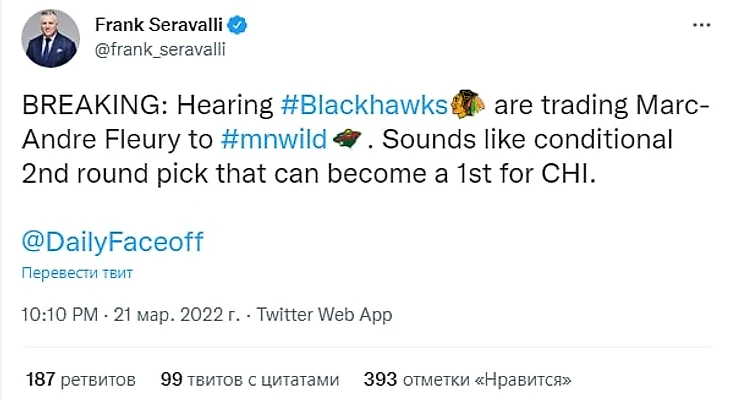 И еще подробности по Флери: «Блэкхокс» уведомили Марка-Андре о переговорах еще до совершения сделки. Вежливость!