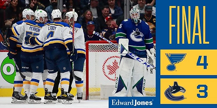 "Ванкувер Кэнакс"-"Сент-Луис Блюз" 3:4.Райан О'Райлли набрал 2 очка (1+1),Давид Перрон отдал 2 результативные передачи,Вилле Хуссо отразил 22 броска.У хозяев Элиас Петтерссон забросил 2 шайбы.
