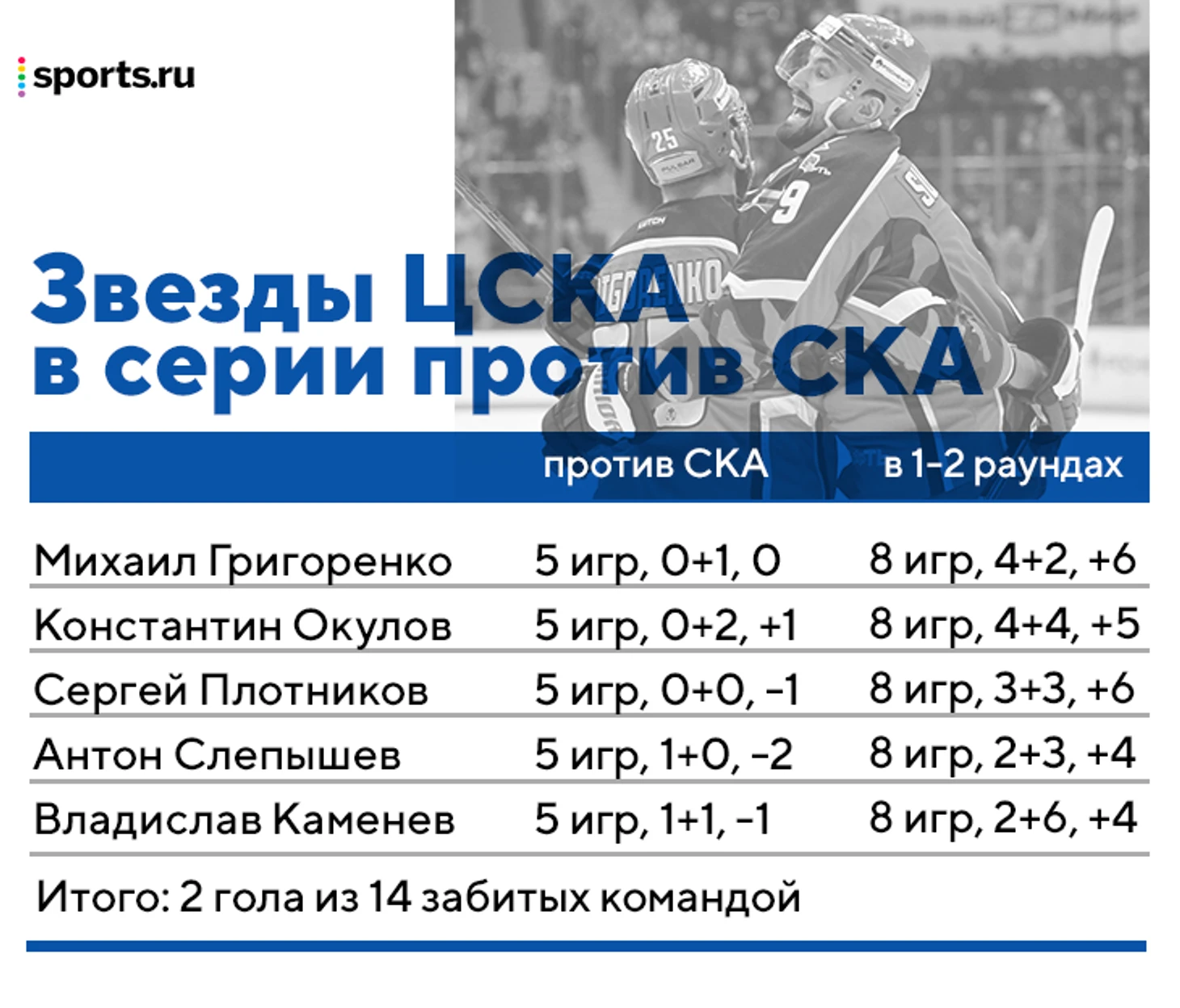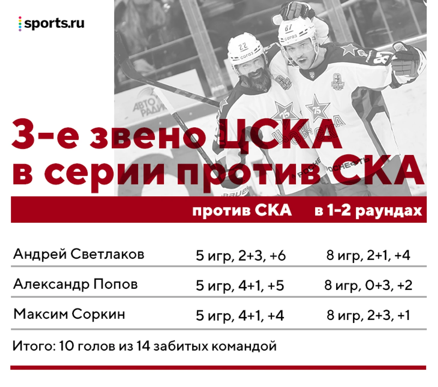 2 гола в 5 матчах на пятерку нападающих, которые были лучшими по очкам в регулярке и имеют самое большое игровое время в команде в плей-офф. 2 гола против 10 у игроков третьего звена. Если это не изменится, у ЦСКА нет шансов.