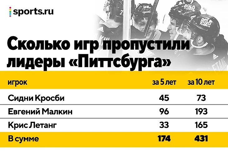 Статистика – вещь упрямая. Помимо ужасного минуса, у Малкина есть еще одна большая проблема. За последние 10 лет он из-за травм пропустил 193 игры – это две полных регулярки и еще где-то треть.