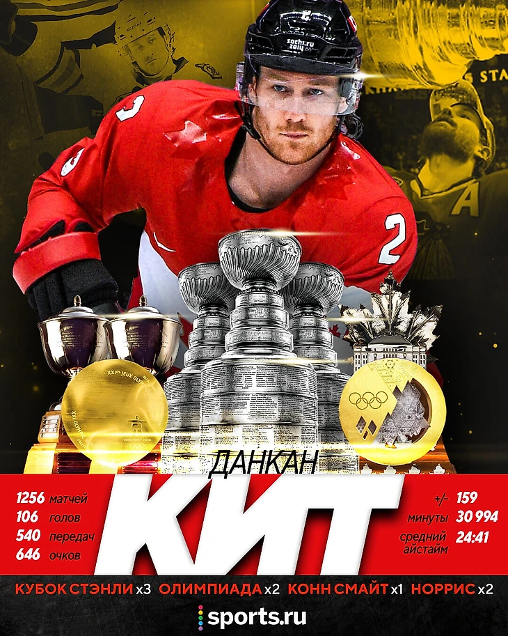Грустно стало после новости о том, что Кит заканчивает. Он из той когорты хоккеистов, чей профессиональный путь лично мне удалось отследить от драфта до завершения карьеры. Да, были суперзвезды (Гретцки, Гашек, Бродо и многие другие), "последние матчи" которых застал, но в силу возраста я не следил за ними на старте карьеры. А таких как Кит, по сути, знаешь 20 лет - от прыщавого пацана, до обладателя всех лучших хоккейных наград. Уходит поколение очень крутых ребят.