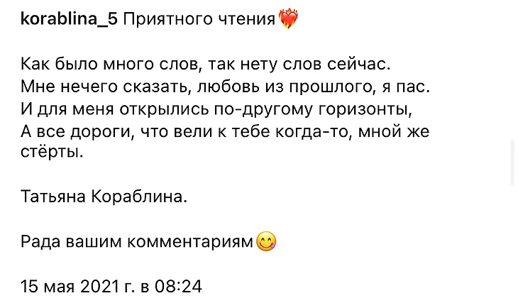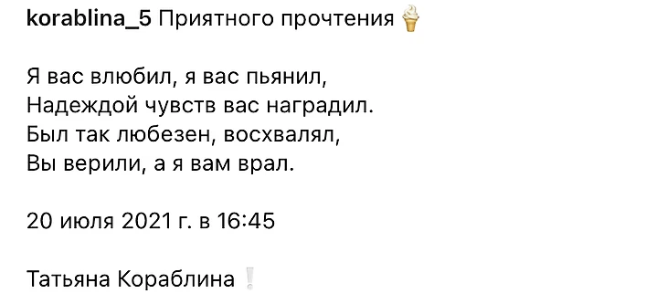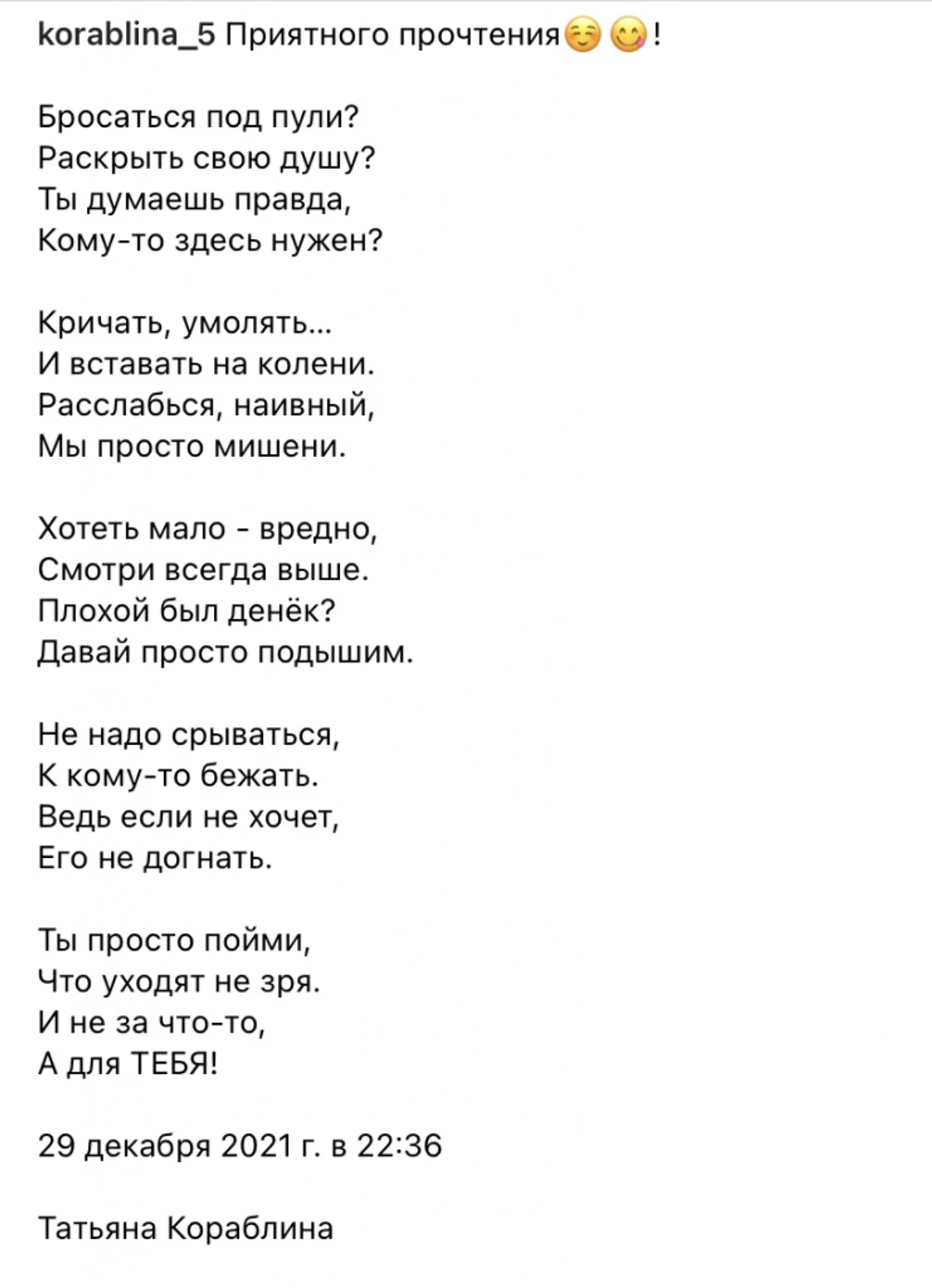 В социальных сетях Кораблина делится не только спортивными достижениями − хоккеистка увлекается поэзией и часто выкладывает свои сочинения в сеть.