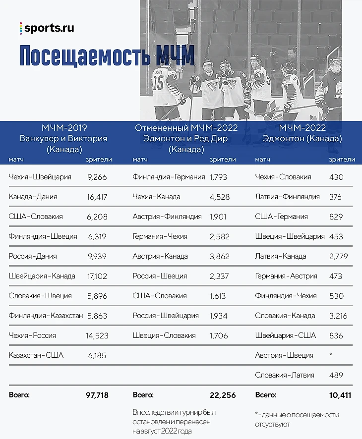 Даже состоявшиеся матчи отмененного МЧМ в декабре собрали больше зрителей, хотя в тот период все равно действовали коронавирусные ограничения. Сейчас их нет, как и не было три года назад в 2019-м, когда турнир прошел в канадских Ванкувере и Виктории. Мы собрали цифры посещаемости в первых 10 матчах МЧМ-2019 и сравнили с текущими. Разрыв просто сумасшедший.