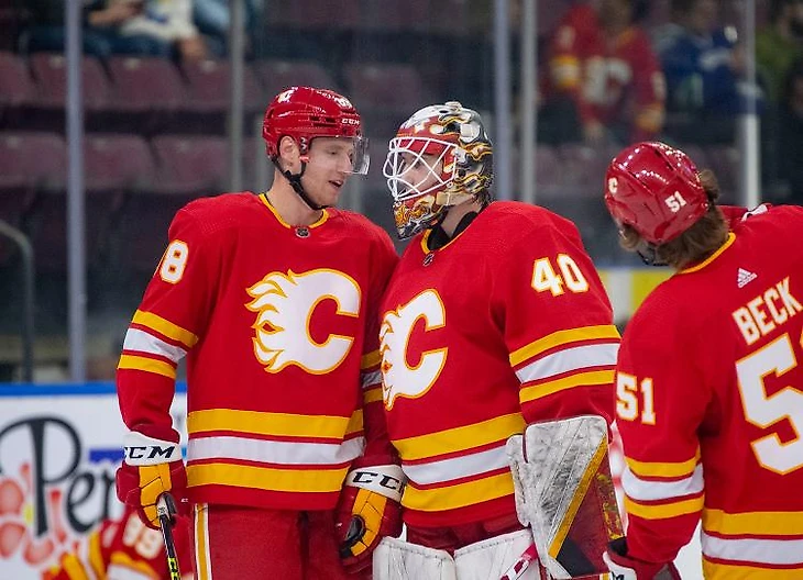 Митч Лав активно ротировал состав, в том числе и прямо походу матчей. Если против Ванкувера в воротах начинал Дастин Вольф, а на льду сочетания: