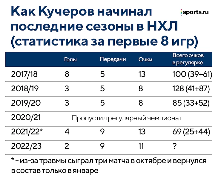 Вообще, как правило, на старте сезона лидер «Тампы» берет время на раскачку. Обычно за первые 8 игр Кучеров набирает меньше – в прошлом сезоне этот отрезок растянулся из-за травмы, а до этого подобный мощный рывок в первых играх регулярки он делал еще в 2017-м.
