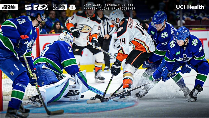"Ванкувер Кэнакс"-"Анахайм Дакс" 8:5.Элиас Петтерссон набрал 5 очков (1+4),Андрей Кузьменко набрал 4 очка (3+1),Бо Хорват набрал 3 очка (2+1),Коннор Хьюз отдал 2 результативные передачи,Илья Михеев отдал результативную передачу,Спенсер Мартин отразил 26 бросков.У гостей Трой Терри набрал 3 очка (1+2),Тревор Зеграс и Райан Стром набрали по 2 очка (1+1),Йон Клингберг отдал 2 результативные передачи.