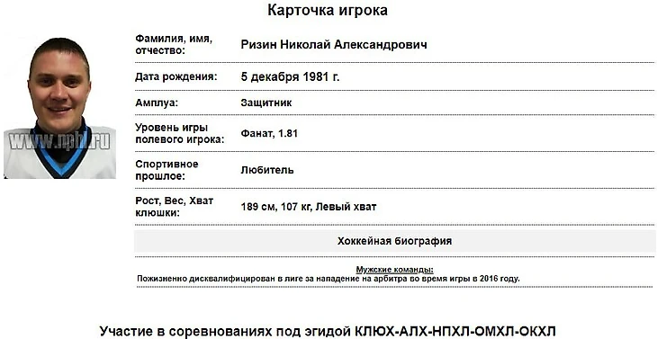 Но даже такие наказания его не исправили – в апреле 2021-го по ходу матча «Стальные Крылья» – «Ледокол» в Российской товарищеской хоккейной лиге Ризин рукой отправил голову арбитра в борт. Защитника, конечно, удалили, но новостей о каких-то дополнительных мерах нет ни в соцсетях лиги, ни на ее сайте.