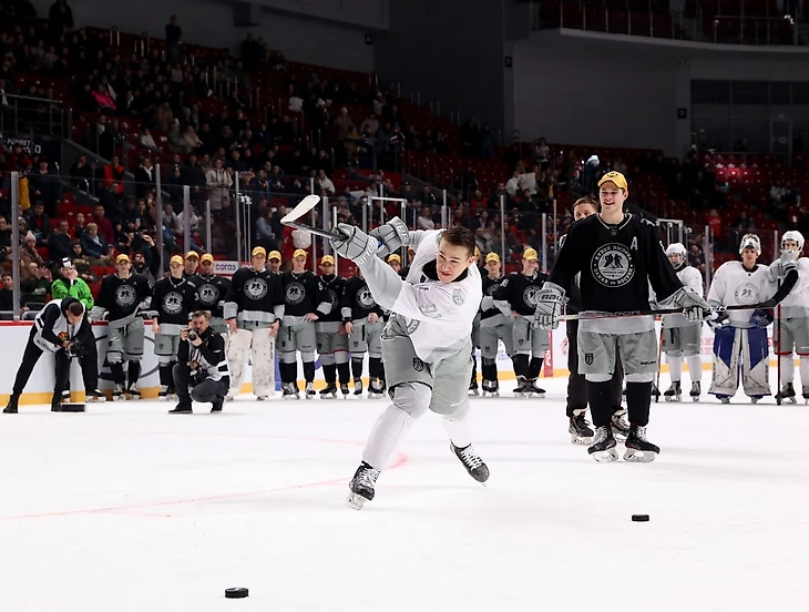 Организаторы придумали для парней конкурс, чтобы определить, кто в какой команде окажется на Матче Звезд. Нужно было бросать по специальным мишеням на воротах – хоккеисты выбили себе места в дивизионах Боброва, Харламова, Чернышева и Тарасова соответственно.