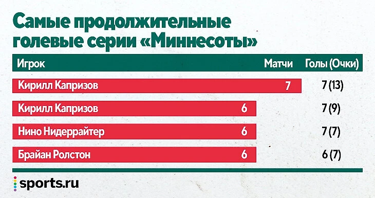 Для полноты картины – пару фактов. Серия Капризова из 7 матчей с голами – самая длинная в этом сезоне НХЛ. У Джейсона Робертсона и Никиты Кучерова было только по 6. Если брать весь отрезок из 13 матчей с очками, то в регулярке круче пока только Робертсон (у него было 18 игр) и Митч Марнер, который не уходит со льда без очков уже 20 матчей и продолжает свою серию.