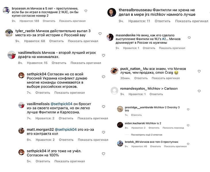 Я думаю, спорить о превосходстве Матвея над Фантилли, Карлссоном и Сэйлом сейчас бесполезно- весь мир знает, что Мичков>>>эти ребята. Чтобы в этом убедиться достаточно почитать комментарии под постом TSN о предстоящем драфте (приложу часть из них ниже)