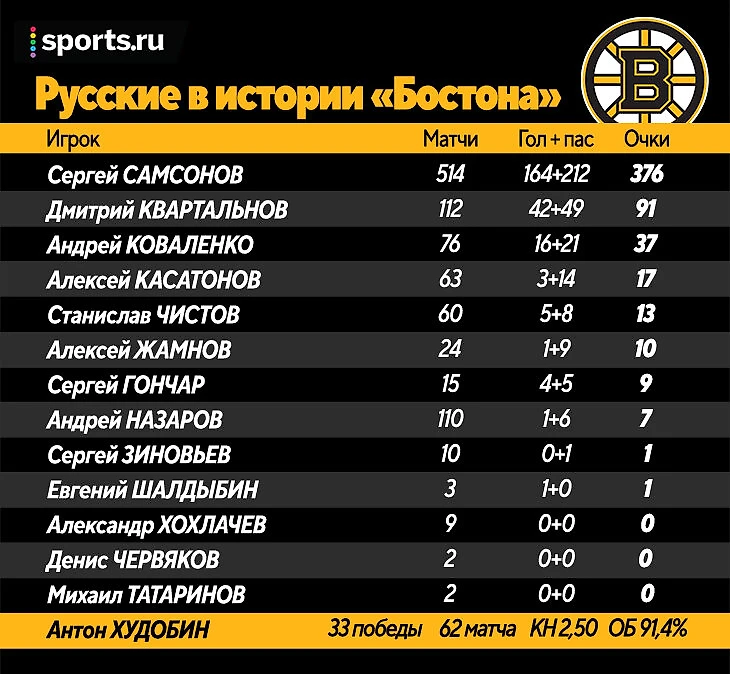 Орлов станет первым русским в команде с сезона-2017/18, когда там выступал Антон Худобин. Вообще у наших в «Бостоне» дела шли не особо – из 13 полевых и одного вратаря больше 100 игр за клуб сыграли всего трое. Один из них – Сергей Самсонов – провел очень достойную карьеру, был достаточно важным игроком, выиграл «Колдер» и отыграл в общей сложности более 7 сезонов.
