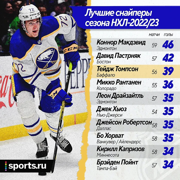Конечно, не обошлось без помощи оборонявшихся игроков «Тампы» (в третьем случае выход 1-на-1 ему вообще подарили Сергачев с Кучеровым), но результативность Томпсона все равно поражает – он практически без осечек пользуется такими шансами. Как итог – он третий в списке снайперов сезона. И не сказать, что Макдэвид и особенно Пастрняк недосягаемы.
