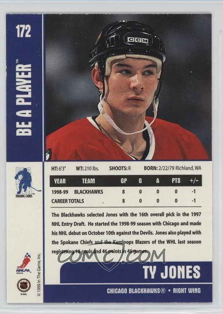 Тай Джонс провёл всего 14 игр в NHL, набрав ноль очков. Чтобы сотворить это чудо, потребовалось два сезона - первый и последний в профессиональной карьере. В первый раз он вышел на лёд в сезоне 1998-99, а последний в сезоне 2003-04. Между этими взлётами было три года скитаний по низшим лигам, где Джонс не особо-то и выделялся.
