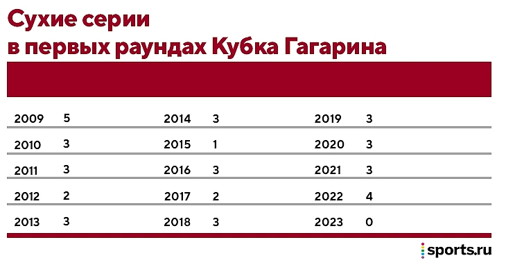 Даже любимый многими Кубок Гагарина-2014 начался с трех стандартных свипов. Занятно, что ближе всего к рекорду был Кубок Гагарина-2015, но там ЦСКА сразу же достался ХК «Сочи» – и шансов не было. Тогда получился довольно занятный розыгрыш: с «Сибирью» в финале конференции и семиматчевой серией ЦСКА – СКА. Хочется верить, в этот раз будет как минимум не хуже.