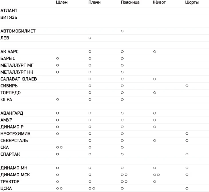 Вот визуальные пачкуны, собранные в пять групп по степени запущенности. За рекламу считались не только очевидные логотипы и эмблемы спонсоров, но так же надписи, означающие локацию клубов и гербы городов, занимающие какую-либо позицию, кроме как на груди. Например, у «Северстали» надписи «Череповец» и «Вологодская область» тоже считались рекламой (да и сам логотип клуба, но это уже вне таблицы). Реклама лиги не учитывалась, как печальная данность, точнее, как ярмо: