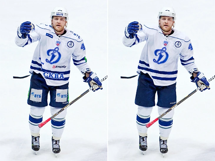Впрочем, одна картинка скажет больше, чем тысячи слов: посмотрите, насколько лучше и чище смотрится форма! Это же почти НХЛ. Для полного эффекта я убрал также и всю КХЛовскую рекламу, кроме эмблемы лиги, хотя и был ужасно сильный соблазн привести его к приличному виду: