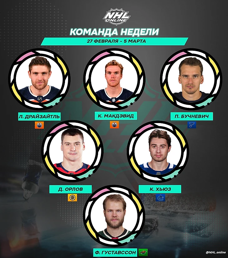 Леон Драйзайтль, бессменный напарник Макдэвида по команде, тоже выдал лихую неделю набрал 8 (5+3) очков, при показателе полезности «+1» и среднем айстайме в 22:18. Кажется, что Леон всегда будет в тени «маэстро», но по игре видно, как игроки взаимодействую и дополняют друг друга, талант Макдэвида невероятен, но Леон отлично дополняет его на льду. Павел Бучневич выдал неплохую неделю несмотря на не самые впечатляющие результаты команды, «Блюзмены» проиграли два матча из трех на прошедшей неделе, сохраняя только теоретические шансы на выход в плей-офф. Но Павел провел неплохой отрезок набрав 7 (1+6) очков в трех играх, с показателем полезности «+2» и среднем игровом времени в 20 минут. Бучневич отлично показал себя при игре в неравных составах, на его счету два ассиста в большинстве, один в меньшинстве и победный ассист в большинстве в матче против «Сан-Хосе».