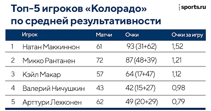 Вообще очень жаль, что Ничушкину помешали старые травмы и осложнения после операции, из-за которых он пропустил почти 30 игр. Судя по результативности – он набирает в среднем почти очко за игру – это мог быть его лучший сезон в карьере. Теперь уже нет вообще никаких сомнений, что Валерий стал лучшей версией себя в «Колорадо», и у него еще будут шансы побить личный рекорд.