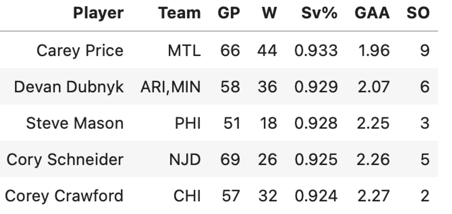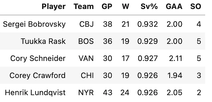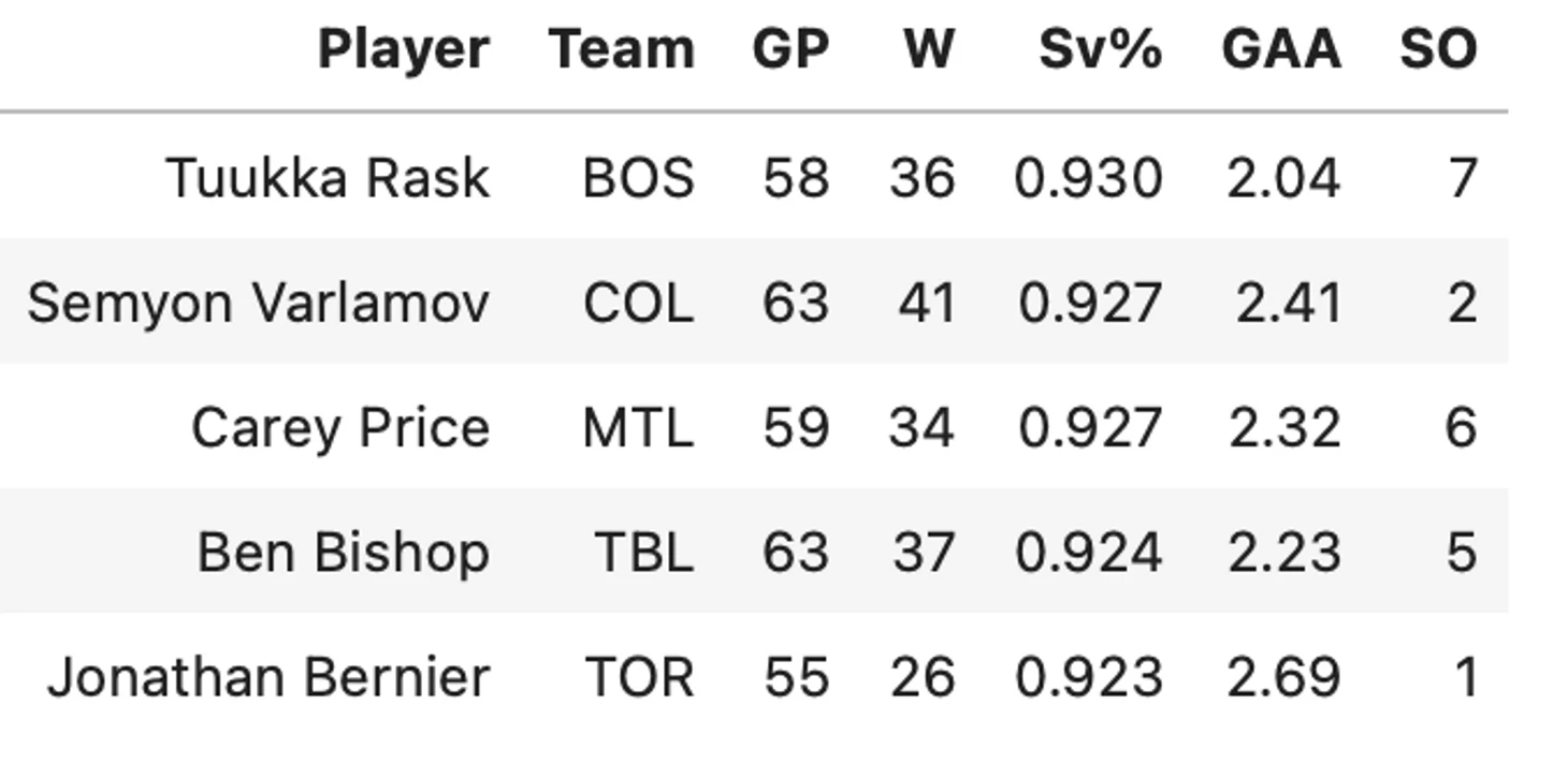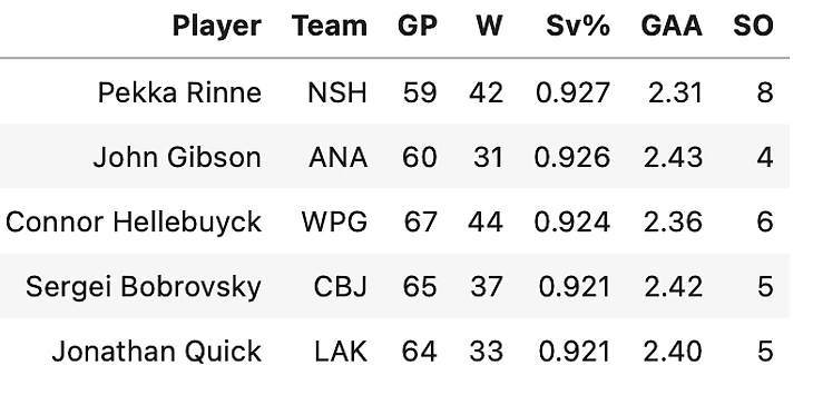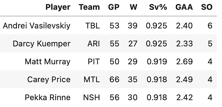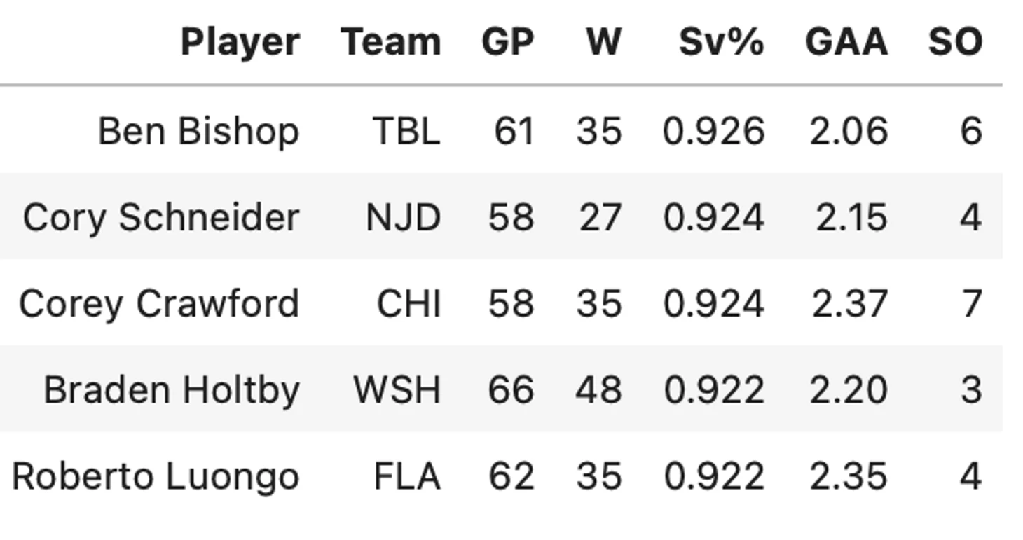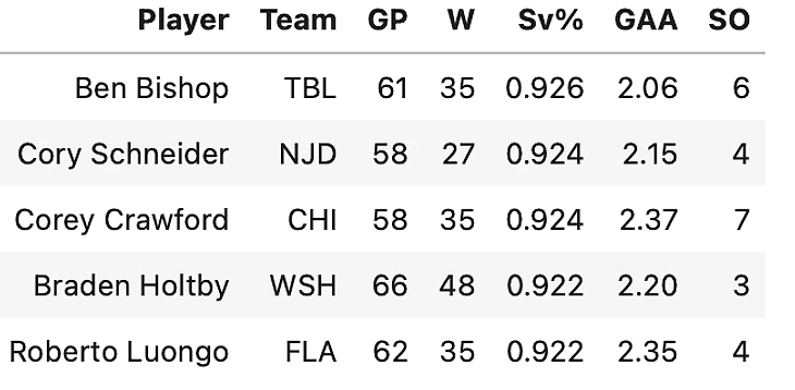 Как следует из таблицы , Ben Bishop (0.926) был лучший в регулярке, потом дошел до финала конференций в плей-офф. Обладатель Кубка в этом году - Murray, сыграл только 13 игр в регулярке, поэтому не попал в итоговую таблицу. Martin Jones и Andrei Vasilevskiy остались в не пятерки лучших с 0.918 и 0.910, соответственно.
