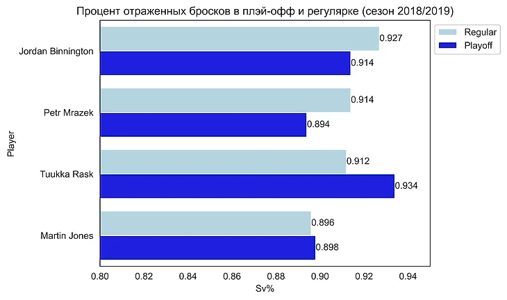 Видно, что Tuukka Rask заметно поднял свой показатель Sv% до 0.934 и был лучшим в плей-офф, а Бостон дошел до финала Кубка Стенли,где был бит Сент-Луисом, в рамке которых играл Binnington Sv%=0.914, что меньше его показателя в регулярке. Petr Mrazek дошел до финала конференции и по итогам у него процент отраженных бросков составил 0.894!!!!, а Martin Jones с 0.898!