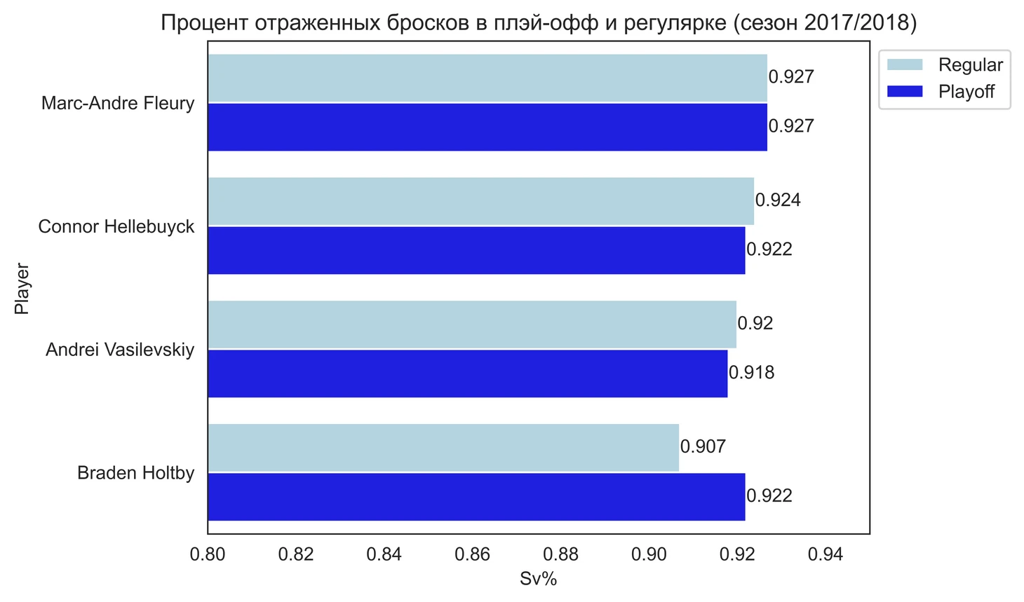 Итог:лучший вратарь плэй-офф 2017/2018 Marc-Andre Fleury (Sv%=0.927) проиграл в финале Кубка Стенли.