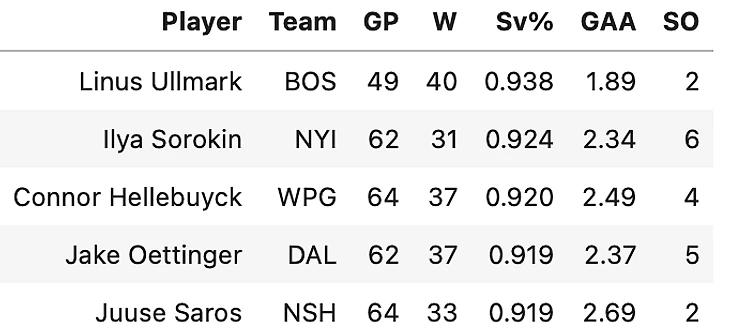 Вот что мы имеем перед началом плэй-офф сезона 2022/2023. Лучший в регулярке Linus Ullmark Sv% = 0.938, следом Ilya Sorokin с 0.924, немного меньше у Connor Hellebuyck и Jake Oettinger, ну а Juuse Saros - мимо плэй-офф.