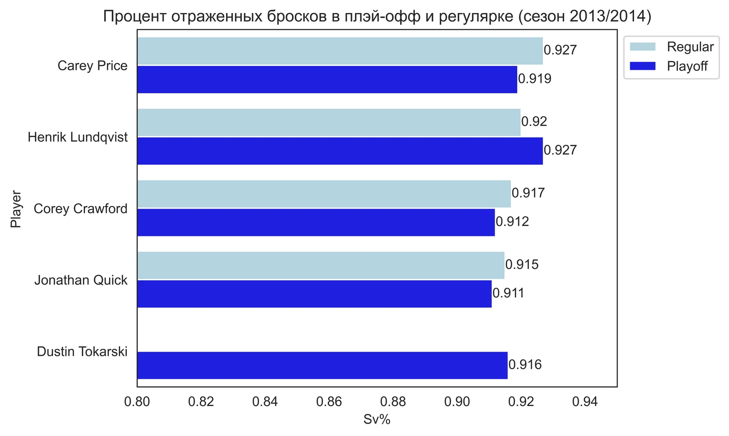 Итог: лучший вратарь регулярки 2013/2014 Tuukka Rask (Sv% = 0.930) вылетел во 2-м раунде плэй-офф.