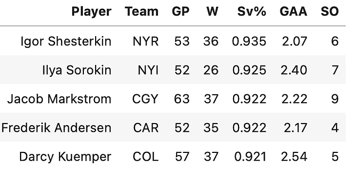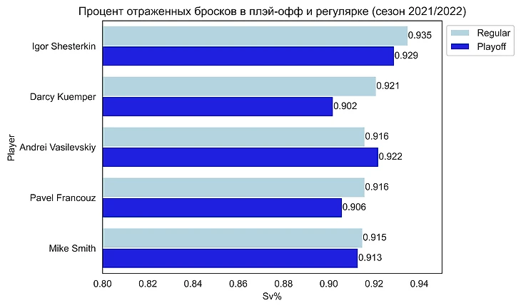 Лучшим в регулярке сезона 2021/2022 был как и в плэй-офф Igor Shesterkin с Sv% = 0.935, Ilya Sorokin - не попал в плэй-офф, Jacob Markstrom,Frederik Andersen - вылет во втором раунде. Будущий обладатель Кубка Darcy Kuemper попал в топ-5 с 0.921.