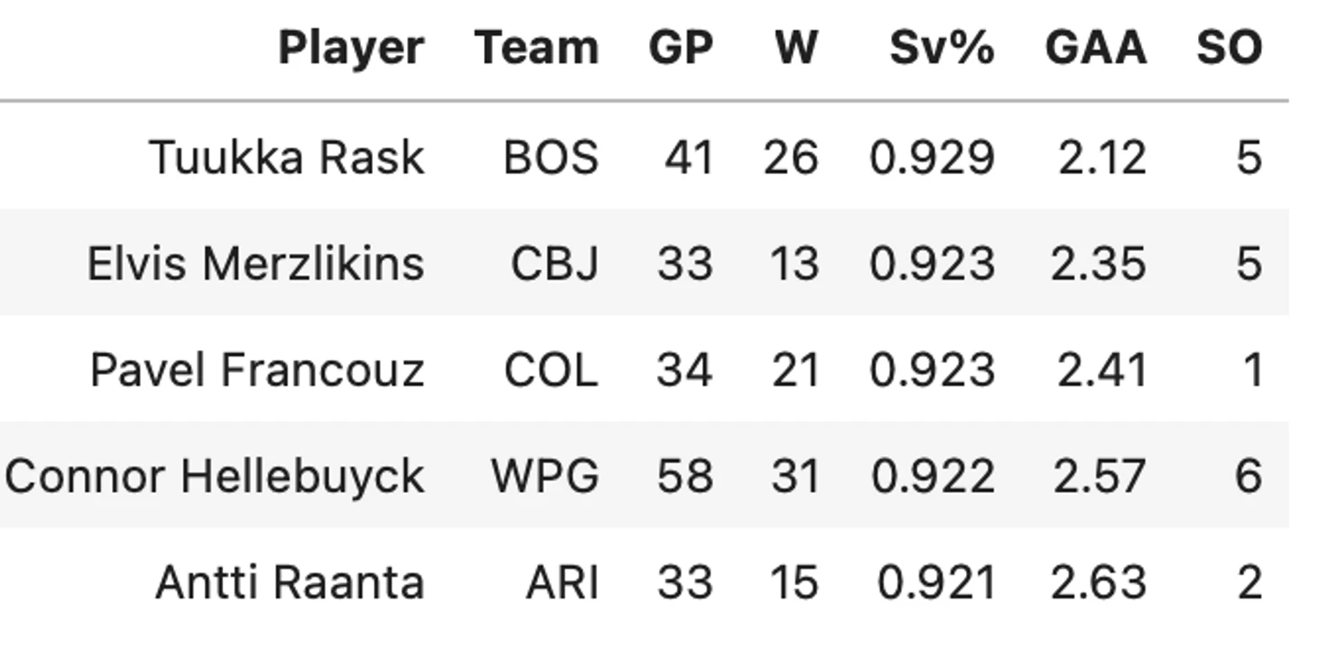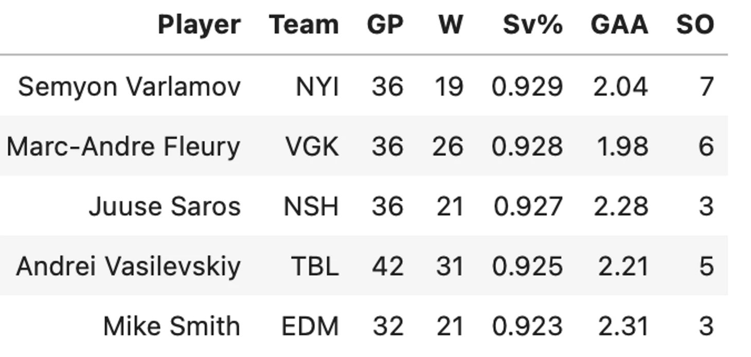 В этом регулярном сезоне сыграли всего 56 матчей, поэтому в итоговую таблицу попали вратари с 30 и более матчами (примерно 60% сыгранных матчей). Лучшим в регулярке 2020/2021 стал Semyon Varlamov (Sv%=0.929), а вратари-финалисты конференций Marc-Andre Fleury и Andrei Vasilevskiy на сотые доли показали меньший процент отраженных бросков.