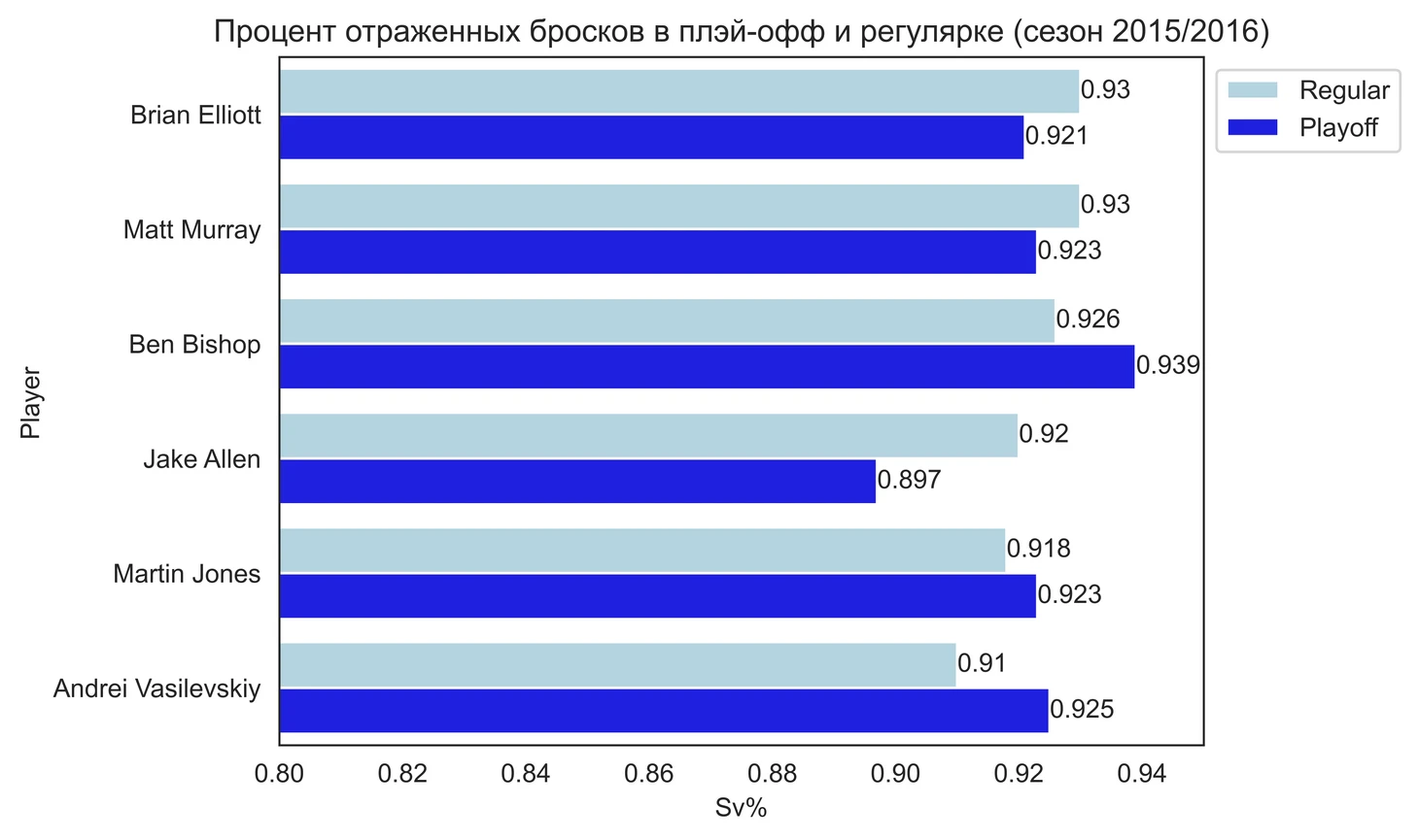 В этом сезоне уверенная игра Bishop-а и Vasilevskiy-кого, которые заметно улучшили показатель Sv% в плей-офф до 0.939 и 0.925, соответственно, не помогла Тампе выйте даже в Финал Кубка Стенли. Martin Jones был надежен и немного поднял Sv% в плейй-офф до 0.923, протиснувшись в финал с Сан-Хосе. А вот тандем вратарей Сент-Луиса Elliott-Allen сдали относительно регулярки (особенно Allen, до 0.897), возможно, дополнительных сэйвов не хватило для выхода в финал или атака Сент-Луиса не потянула,ведь у Jones-а близкий к Elliott-у показатель Sv%. Реашайте сами.