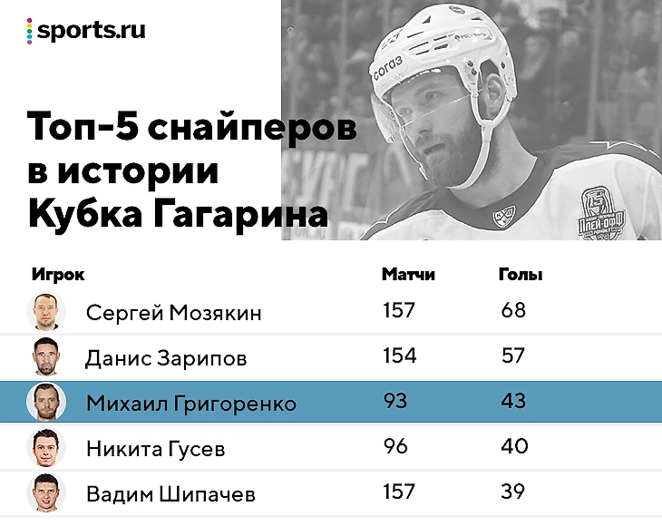 В плей-офф Григоренко забивает 0,46 гола за игру. Для КХЛ это очень много – из тех, кто прилично поиграл в Кубке Гагарина, лучше цифры только у Дадонова (0,48 – 34/71).