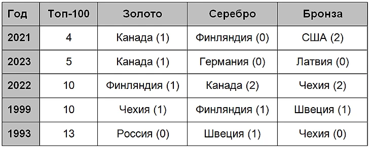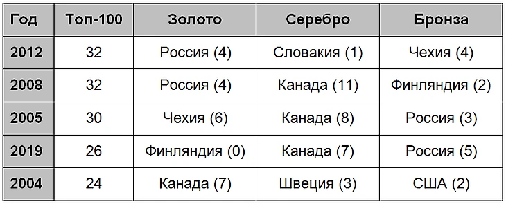 Внимательный читатель, вероятно, уже обратил внимание: оба рекордных ЧМ, 2008 г. и 2012 г., выиграла сборная России. Канадцы на первом турнире были в финале, а на ЧМ12 – проиграли в 1/4. Вот как выглядят общие результаты пяти самых представительных ЧМ.