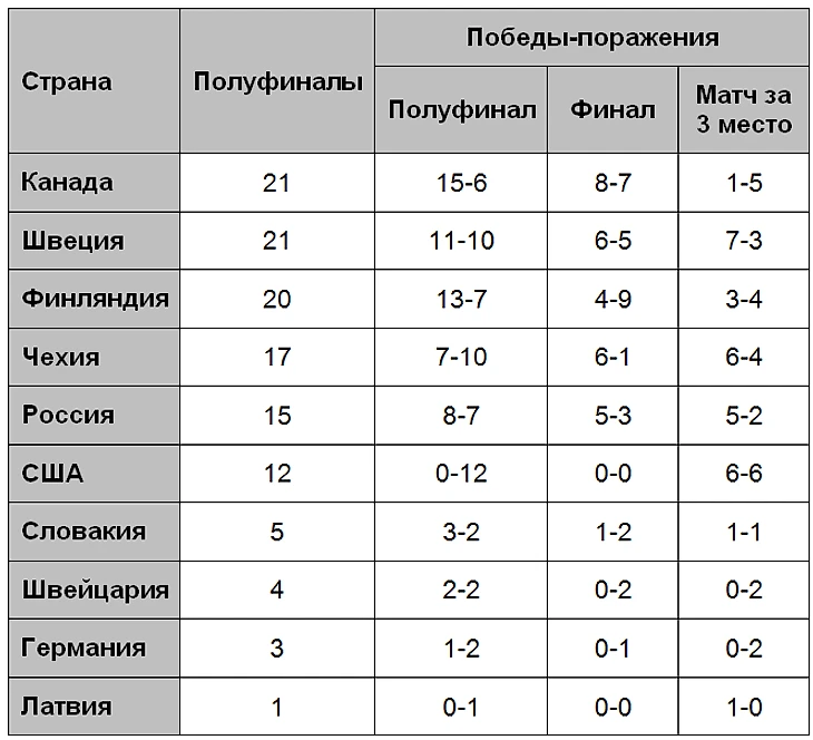По числу полуфиналов США занимает шестое место, при этом отрыв от занимающей пятое место России существенно меньше, чем от идущих седьмыми словаков: большую шестёрку не зря так называют. Но, если по числу сыгранных полуфиналов американцы занимают положенное им место, то по числу поражений они – лидеры забега. То есть двенадцать поражений в полуфинале – это много. Кроме того, если бы не Латвия, американцы в этом году остались бы единственной командой, которая играла в полуфинале – и никогда его не выигрывала.