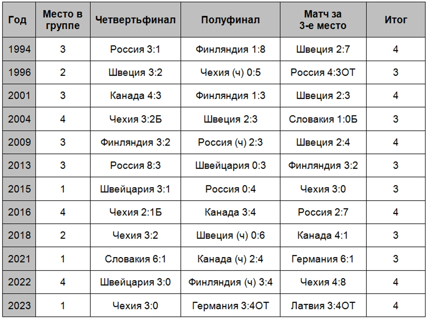 С другой стороны, у словаков, немцев и швейцарцев всего 2 победы в 12 матчах после полуфинала. Точнее – 2 победы у словаков «прекрасной эпохи». А за вычетом оных – 8 поражений в 8 попытках, по 4 в финале и матче за бронзу. Яркий контраст в сравнении с американцами, выигравшими ровно половину своих последних матчей на турнире.
