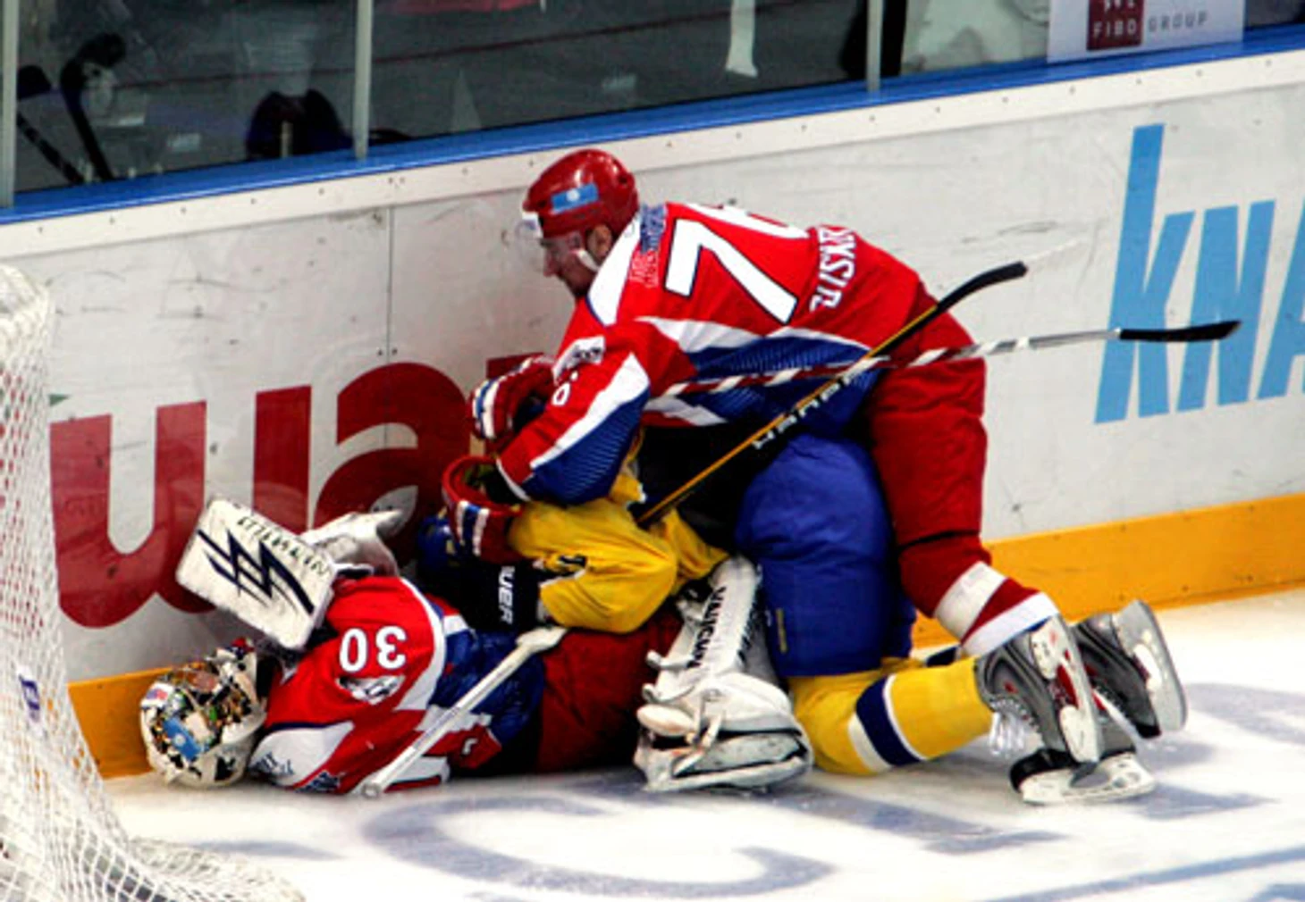 Александру Еременко этим вечером приходилось отбиваться не только от шайб, но и от навязчивых соперников. Когда в один из таких моментов верхом на российском голкипере оказались сразу двое хоккеистов � Юхан Харью и Александр Гуськов, � многотысячные трибуны «Мегаспорта» испуганно затаили дыхание. На чемпионате мира в Квебеке такой тесный контакт с соперником оказался для Еременко фатальным. На этот раз, к счастью, обошлось.