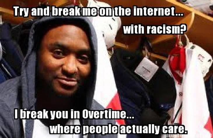 Несколько устаревший, но не потерявший актуальности ответ болельщиков Джоэля Уорда расистам. «Пытаетесь сломать меня через интернет расистскими высказываниями? Я сломаю вас там, где это действительно важно – в овертайме».