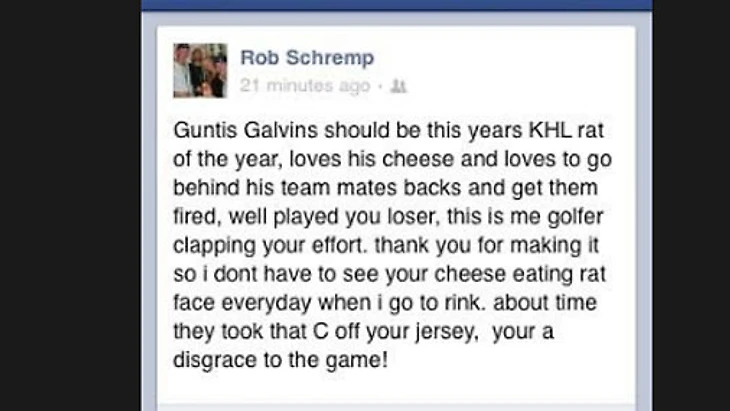 «Галвиньш должен стать крысой года в КХЛ. Ему нравится сыр и обговаривать игроков, в результате чего я и был отчислен. Хорошо сыграно, неудачник. Спасибо что поступил так, теперь мне не придется видеть твою крысиную морду каждый день. Пришло время оторвать у тебя букву «C» с джерси – ты позор этой игры», – покинувший рижское «Динамо» Роб Шремп в одной из социальных сетей.